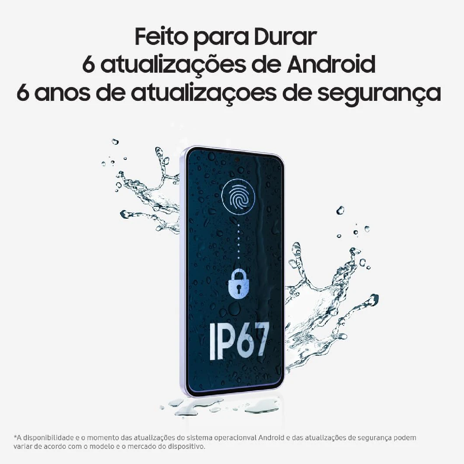 Para acompanhar a rotina, o Galaxy A56 traz certificação IP67 contra água e poeira, oferecendo mais tranquilidade no uso diário. A bateria de 5.000 mAh entrega autonomia para um dia inteiro de uso moderado a intenso, e o carregamento rápido de 45 W ajuda a repor energia em menos tempo quando necessário. O leitor de impressão digital garante desbloqueio rápido e seguro.